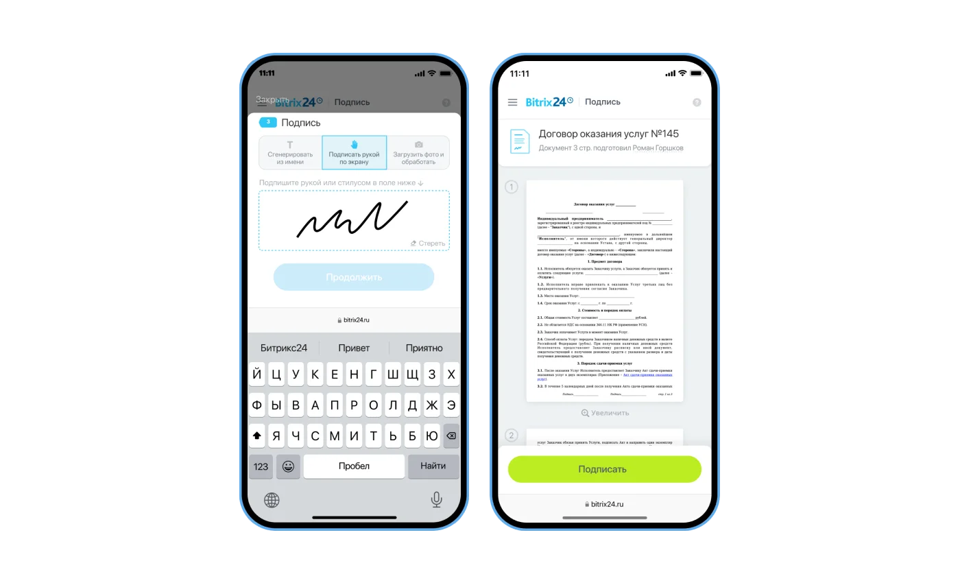 Отправляйте документ клиенту по Email, SMS или WhatsApp. Он может подписать от руки или загрузить фотографию. Отслеживайте весь путь подписания в карточке сделки. Битрикс24 Подпись полностью соответствует 63-ФЗ в отношении простой электронной подписи.