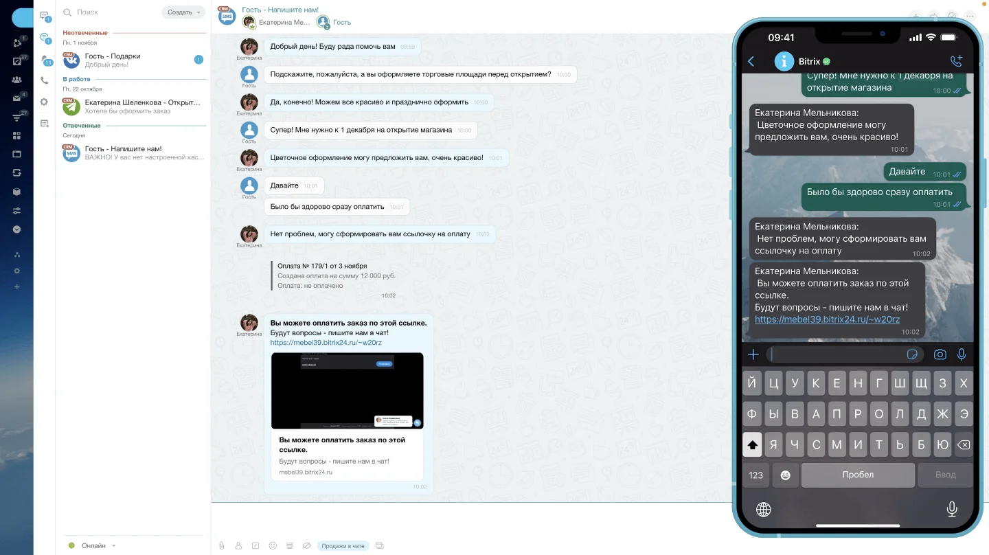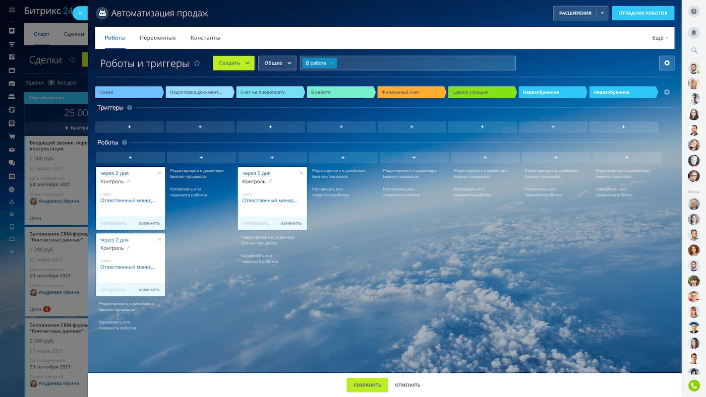 Доверьте рутинную работу роботам. Они вовремя отправят письмо, ссылку на оплату клиенту, добавят или удалят товарную позицию, поставят задачу менеджеру.