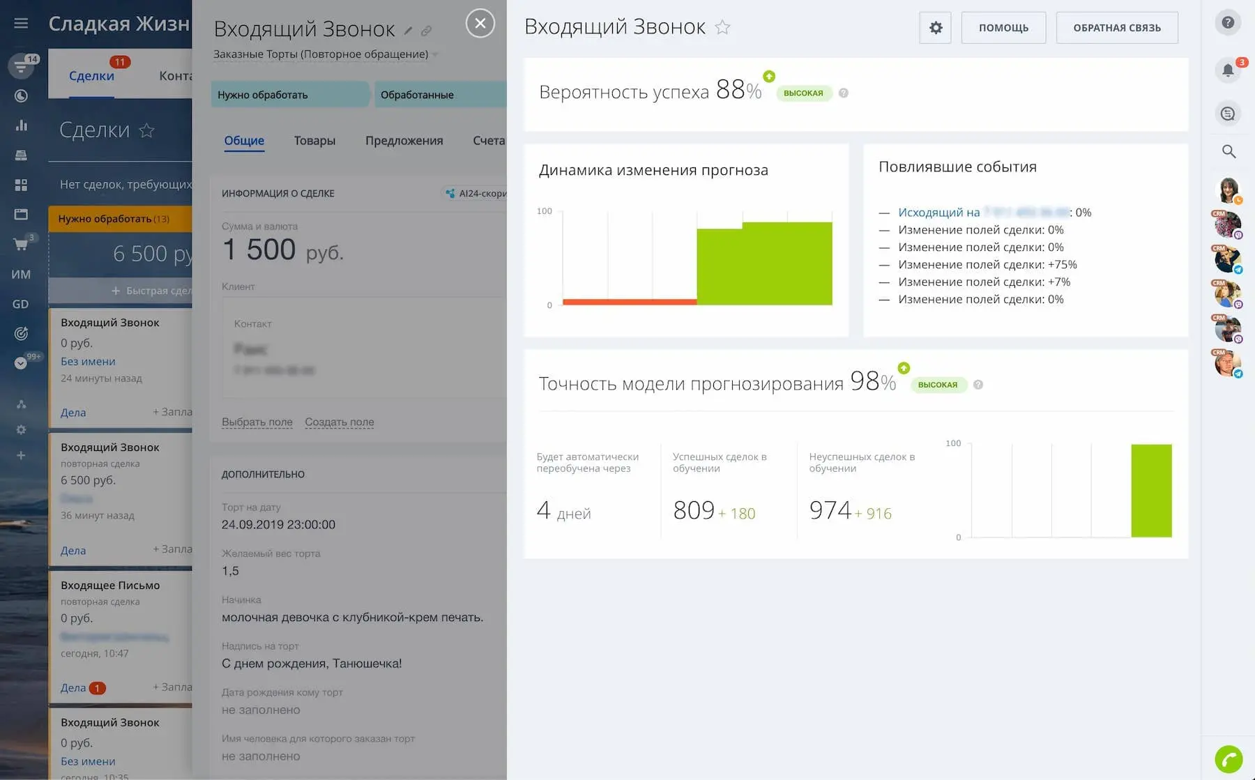 AI (искусственный интеллект) анализирует данные в вашей CRM и предсказывает вероятность успеха сделок.