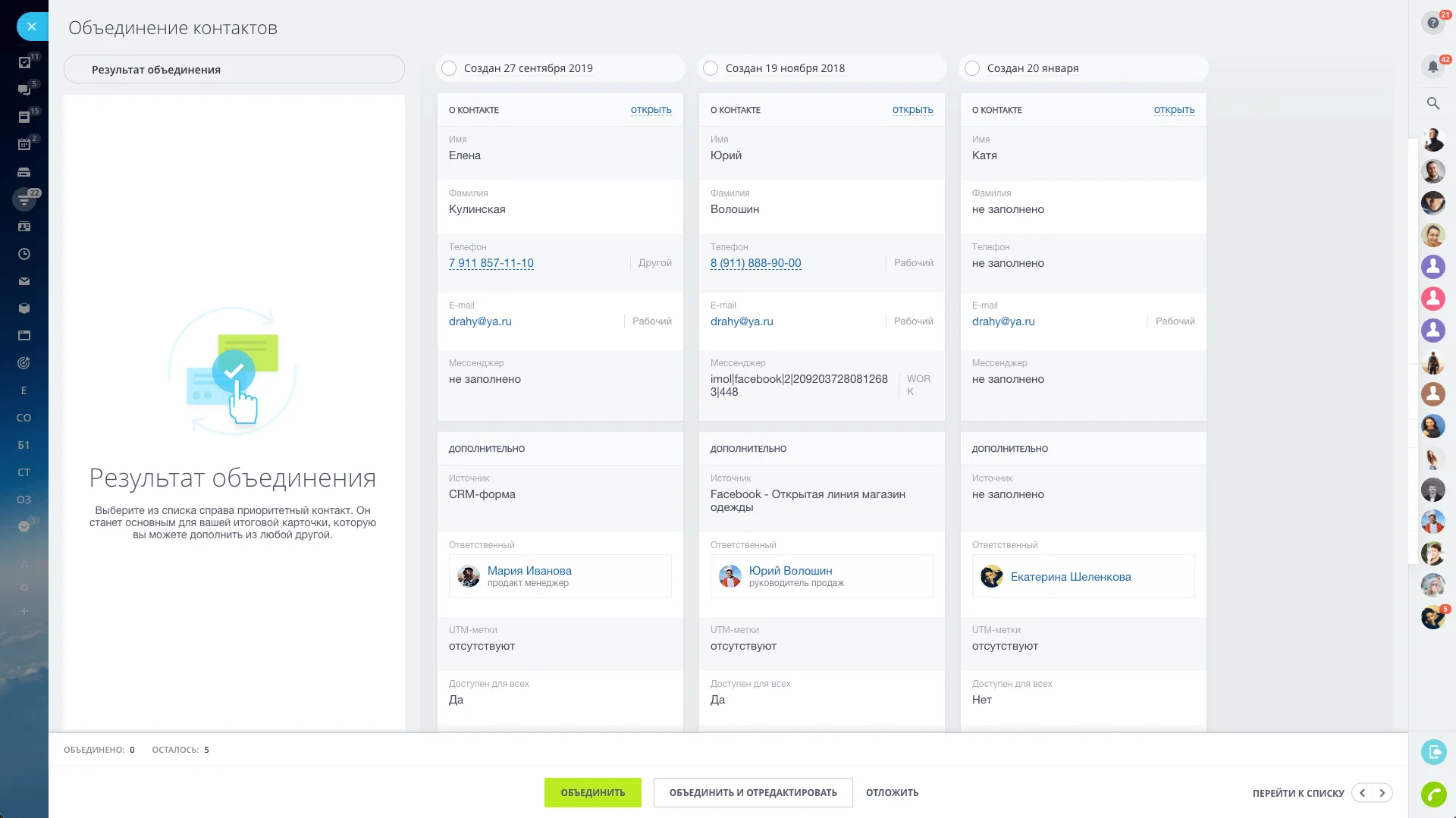Если не все поля совпадают, CRM предложит менеджеру просмотреть дубликаты и объединить их вручную.